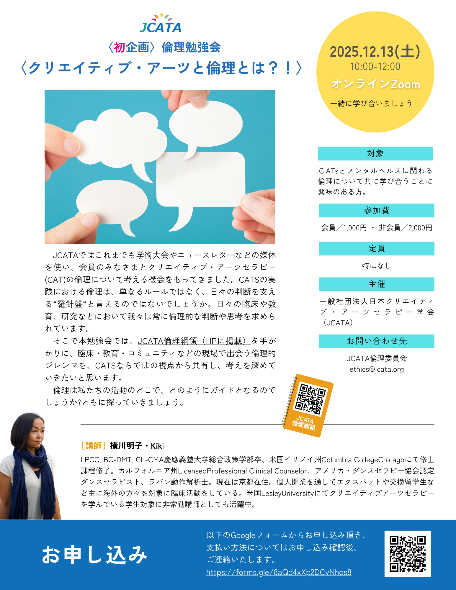 そこで本勉強会では、JCATA倫理綱領(HPに掲載)を手がかりに、臨床・教育・コミュニティなどの現場で出会う倫理的ジレンマを、CATSならではの視点から共有し、考えを深めていきたいと思います。