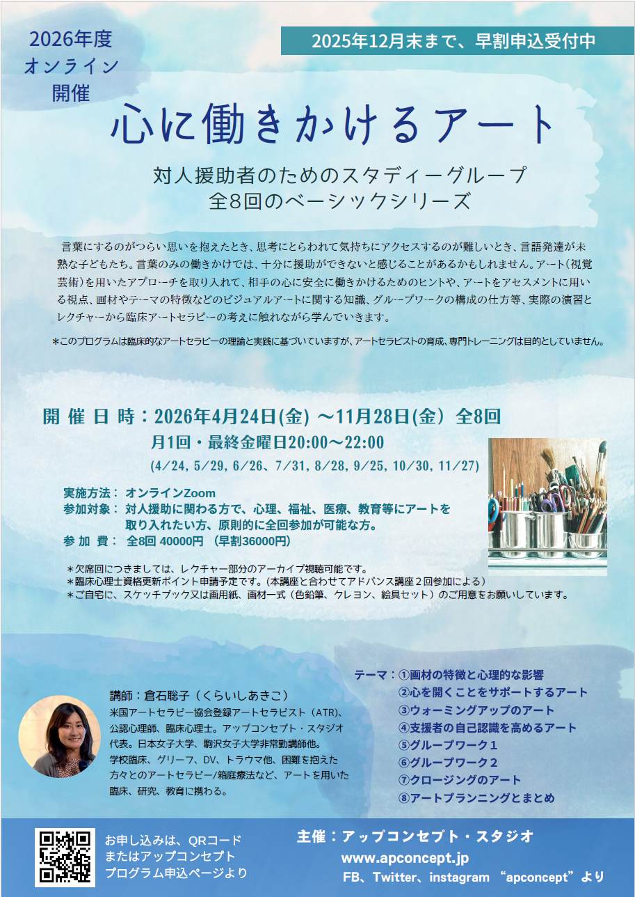 *このプログラムは臨床的なアートセラピーの理論と実践に基づいていますが、アートセラピストの育成、アートセラピーの専門トレーニングは目的としていません。